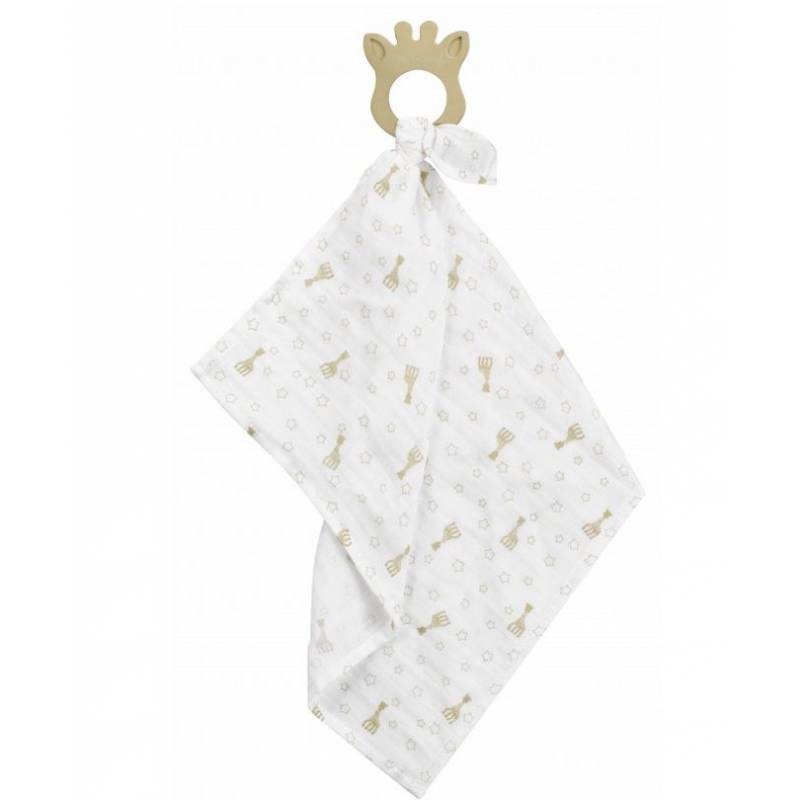 Un anneau de dentition et un lange à l’effigie de Sophie la girafe en caoutchouc 100% naturel et coton 100% bio