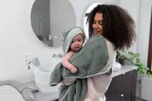 Cette grande cape de bain enveloppe bébé de douceur tout en protégeant les parents des éclaboussures. Astucieux, son anneau en silicone permet d’attacher la serviette autour du cou de l’adulte tel un tablier mais aussi d’occuper bébé lorsqu’on le sèche.