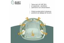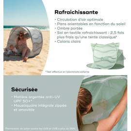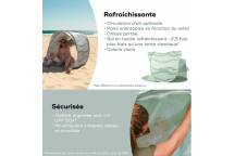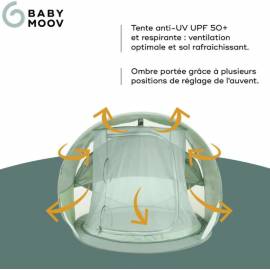 Offrez à votre bébé un espace ombragé, frais et sécurisé avec la tente Moov & Protect. Grâce à son design inspiré des maisons californiennes à double toit, elle assure une ventilation continue et une réduction de la température intérieure de 7,4°C en moyenne par rapport à l’extérieur (testé en laboratoire). C’est l’abri idéal pour les sorties plage, parc ou jardin.