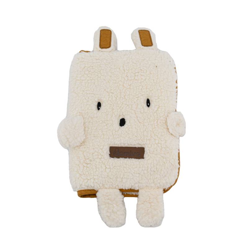 Le protège-carnet de santé Boubou de Domiva allie fonctionnalité et tendresse. Conçu dans un tissu pelucheux ultra-doux, il se distingue par ses tons naturels – ivoire et caramel – et les jolis détails en volume du personnage Boubou : pattes et oreilles délicatement cousues pour une touche ludique et rassurante.