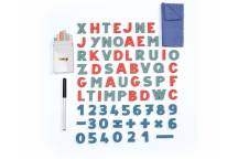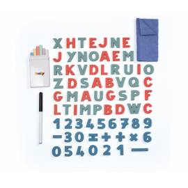 80 accessoires inclus : 1 feutre effaçable, 6 craies de couleur, 72 lettres et chiffres magnétiques, et 1 chiffonnette.