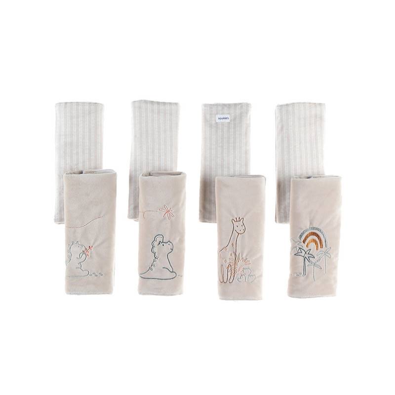 Les protèges barreaux en Veloudoux beige et imprimés nature rebrodés des personnages de la collection Tiga, Stegi & Ops, sont parfaits pour s'adapter aux barreaux ronds ou plats de tous les lits bébés ainsi que des parcs.