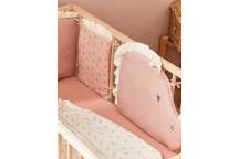 Le tour de lit ajustable, composé de 5 morceaux, se fixe aux barreaux grâce à des rubans.