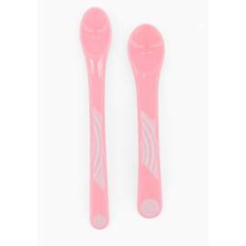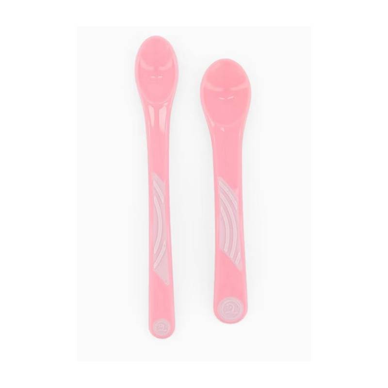 Cuillère d'alimentation en lot de 2 de différentes longueurs : une longue pour nourrir l'enfant et une courte qu'il peut utiliser.