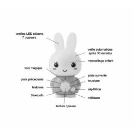 Avec la veilleuse Honey Bunny vous pouvez écouter de la musique ou bien se faire raconter un histoire. Il contient 15 chansons composées par Henri Dès, 15 comptines en anglais et 9 berceuses instrumentales.