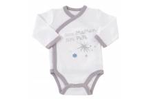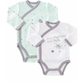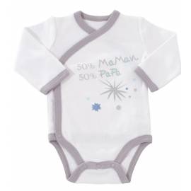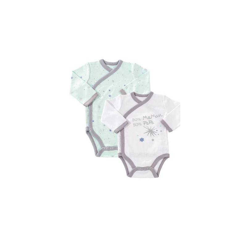 Découvrez ce lot de deux bodies croisés, parfait pour habiller votre bébé avec douceur et praticité. Composé d’un body blanc et d’un vert d’eau, ce duo mixte convient aussi bien aux petites filles qu’aux petits garçons. Le message imprimé « 50% maman, 50% papa » ajoute une touche affectueuse et pleine de tendresse à la tenue de votre enfant.