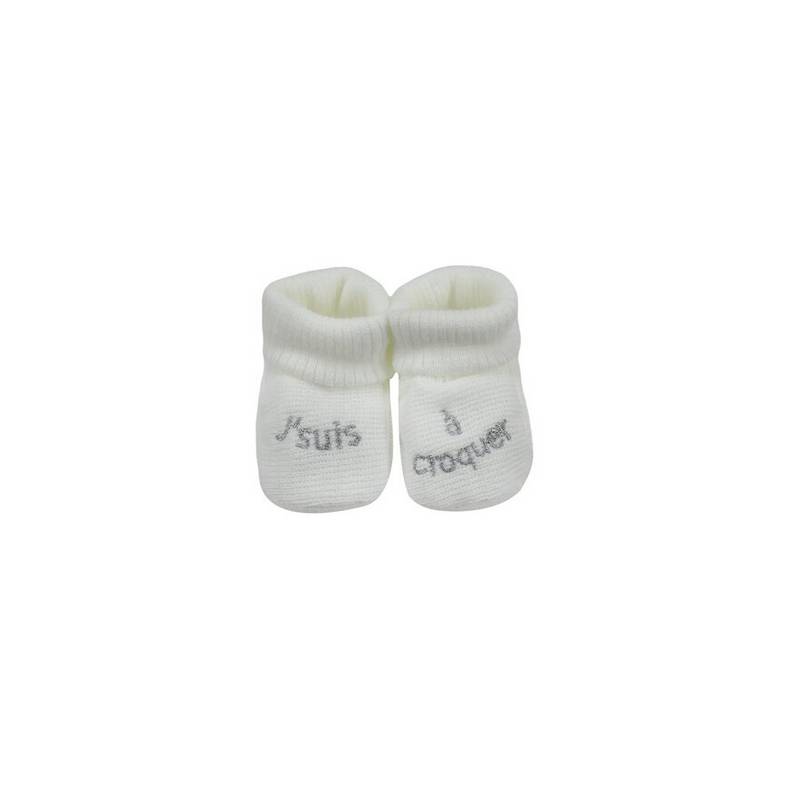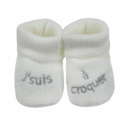 Leur revers en maille côtelée assure un bon maintien sans comprimer, idéal pour les nourrissons. Le message brodé "Je suis à croquer" ajoute une touche d’originalité et de tendresse, parfaite pour les premiers mois.