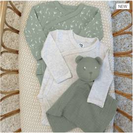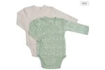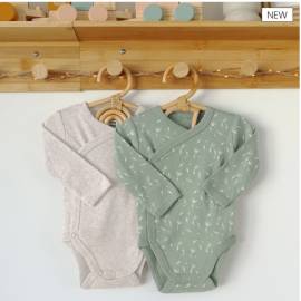 Ce lot de deux bodies manches longues, confectionnés en 100% coton, offre une douceur idéale pour la peau délicate des nouveau-nés. Le premier, dans un beige chiné intemporel, et le second, vert olive décoré d’un motif nature, apportent une touche chaleureuse et apaisante à la garde-robe de bébé.