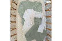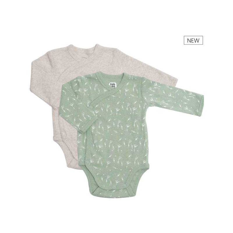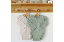 Ce lot de deux bodies manches longues, confectionnés en 100% coton, offre une douceur idéale pour la peau délicate des nouveau-nés. Le premier, dans un beige chiné intemporel, et le second, vert olive décoré d’un motif nature, apportent une touche chaleureuse et apaisante à la garde-robe de bébé.