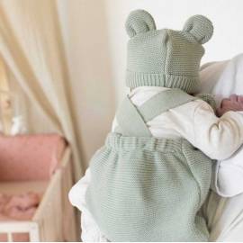 Déclinée dans des teintes naturelles et intemporelles – sauge, caramel, vieux rose et sable – elle s’associe parfaitement avec une brassière en maille, des chaussons ou un bonnet coordonné pour créer une tenue harmonieuse et raffinée.
